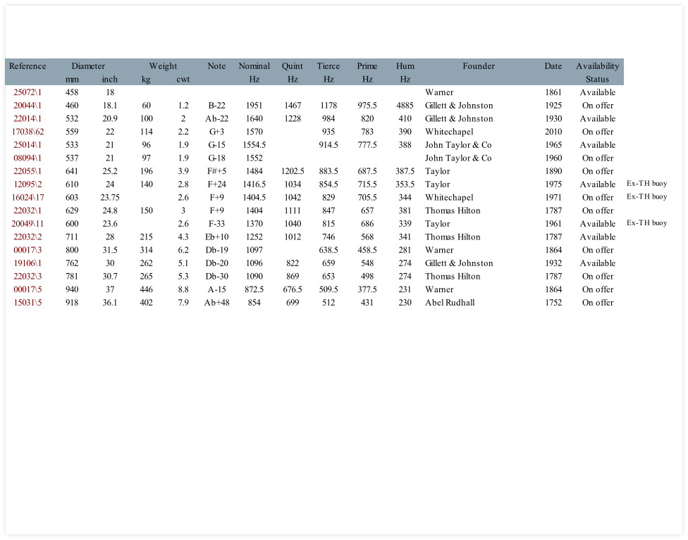 The following bells are either available or likely to become available. The information is given in good faith, but may be inaccurate. Bell notes are specified for International Pitch. All enquiries should be made to the Secretary of the Keltek Trust quoting the bell reference code.
