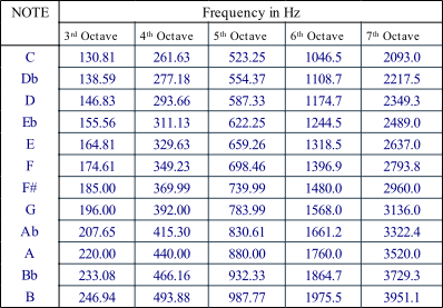 The human ear can detect sounds over a range of about 9 octaves. However the first and last two octaves are not so relevant for church bells. The table below gives the frequencies for the middle five octaves at Standard International Pitch.