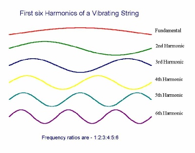 A musical instrument is usually classified as either Wind, String or Percussion. The figure shows the first six harmonics of a vibrating string. The relative amplitudes of the harmonics will depend on how the string is set into vibration (plucking, bowing or striking) the position and strength of the applied force.