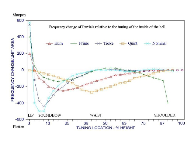 Providing there is sufficient thickness, the partials may be slightly changed in frequency by removing metal from the bell. Equation 1 shows the frequency will decrease as the thickness reduces. However this is a "general" equation and it is possible to slightly increase the frequency of certain partials by cutting back the rim of the bell (skirting). The bell tuner's skill lies in knowing which part of the bell to tune to achieve the desired result. The bell's shape and thickness are the main limiting factors, and these greatly restrict what can be achieved. The graph shows the results of research by E. W. Van Heuven6 of the tuning of a Hemony9 profile bell. The x-axis is the tuning position as a function of height, where 0% is the lip and 100% is the upper crown. The y-axis is tuning effectiveness, and should only be used as a comparison between individual partials.