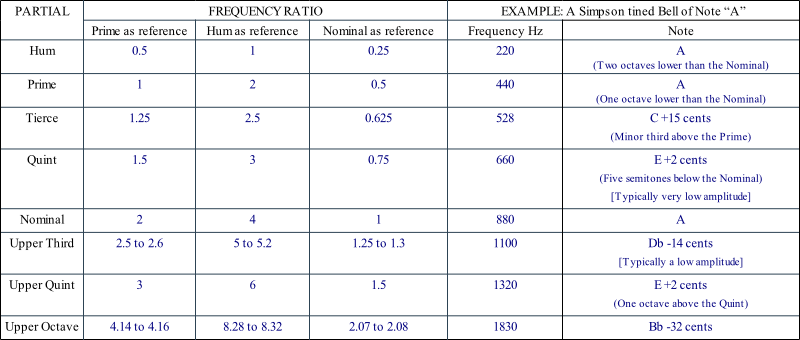 The table shows the frequency ratios and a hypothetical example of a Simpson tuned bell of note "A". It does not matter which partial is used as reference; Simpson's article used the Prime, British bellfounders use the Nominal and vibrational engineers use the lowest frequency - the Hum. For convenience the table shows all three ratios.