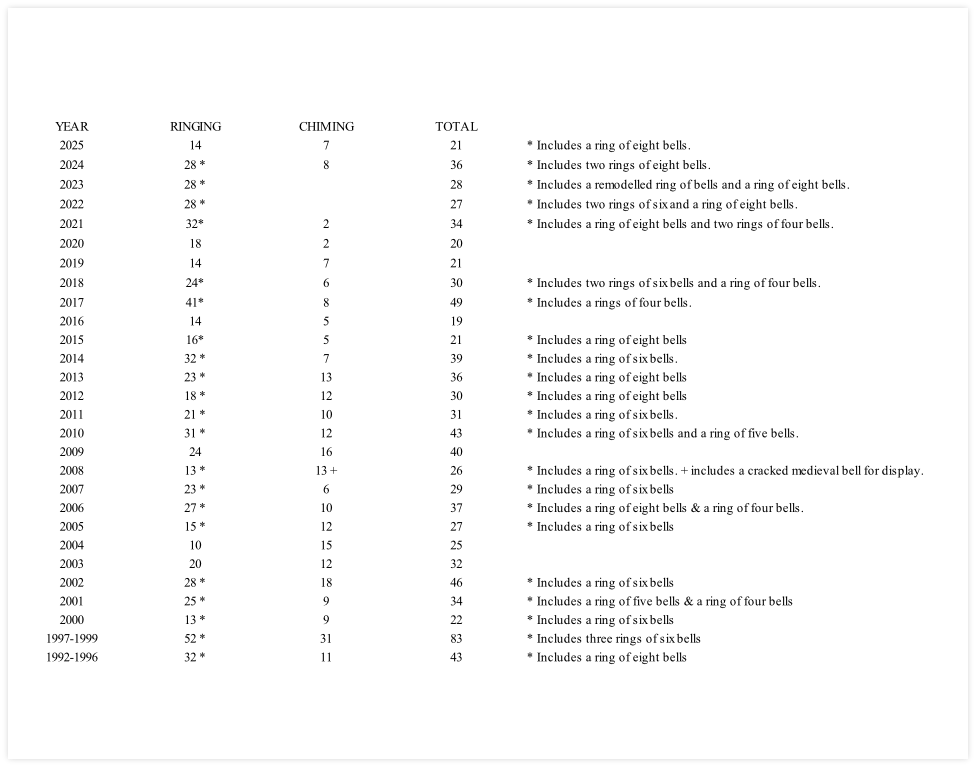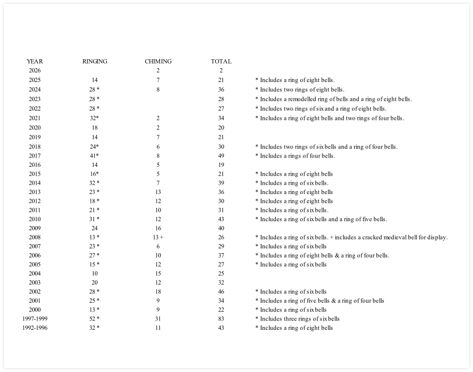 The following table shows the total number of bells we have re-located. It includes the period 1992-96 prior to the formal registration as a charity. The information is based on the date a bell/bells are acquired/accepted by the destination church and not the date of their installation.
