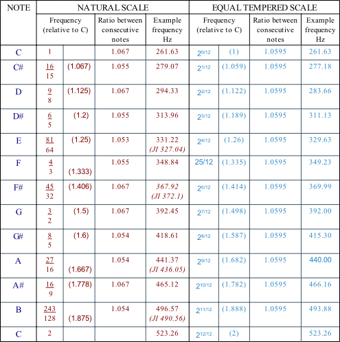 The difference between the Natural and Equal Tempered scales is shown in the table to the left. The example frequencies in italics are for the scale of just intonation which slightly differs from the Natural scale. The example frequencies show that the differences in frequency for some notes are significantly greater than for others, when comparing the two extremes of temperament.