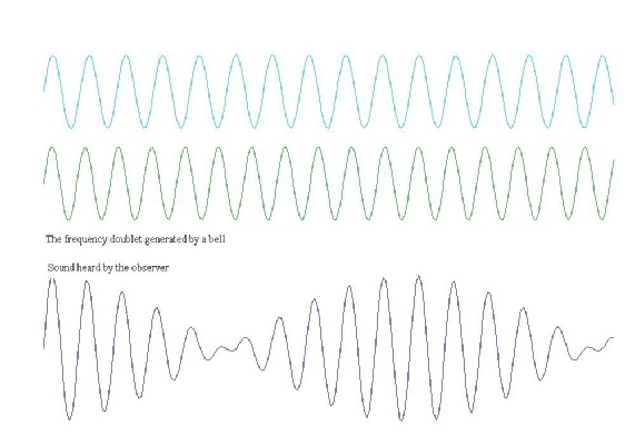 The figure below shows how a vibrating body can generate beats, for clarity the example frequencies have been exaggerated. The first two waveforms show a doublet generated by the vibrating body and the lower waveform shows the resulting sound heard by the listener. It is believed that some medieval founders cast eccentrically shaped bells so that the frequency pairs were so far apart they would not beat2.